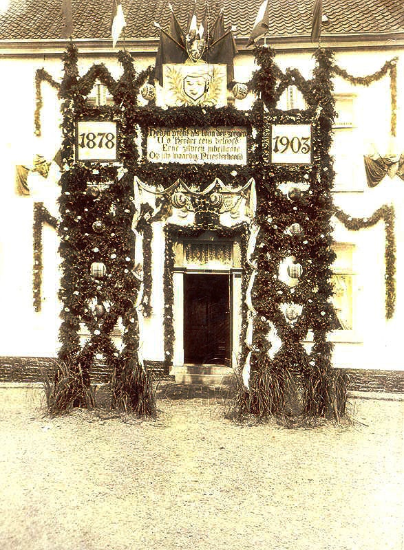 (02291) Versiering van de pastorie voor het 25-jarig priesterfeest van pastoor F. Simons in 1903