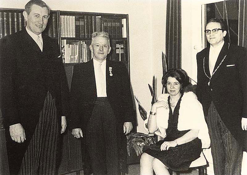 (03458) Wethouder H. Knubben en W. Schreurs verwelkomen op 6 december 1969 de nieuwe burgemeester K. van Gerven en zijn echtgenote mevrouw T. van Gerven-Maessen. V.l.n.r.: Wim Schreurs, Hens Knubben, mevrouw van Gerven en burgemeester K. van Gerven
