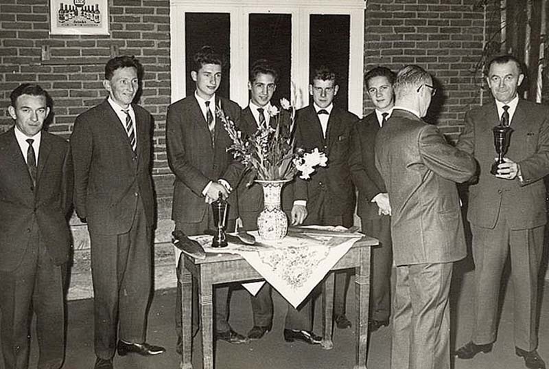 (04090) Horner Beugelclub op de beugelbaan Kessels Sjang, Rijksweg. V.l.n.r.: NN, Wiel Heuyerjans, Piet van Herten, Frits Engelen, Ton Alers, Thei Linssen , NN en Lei Linssen