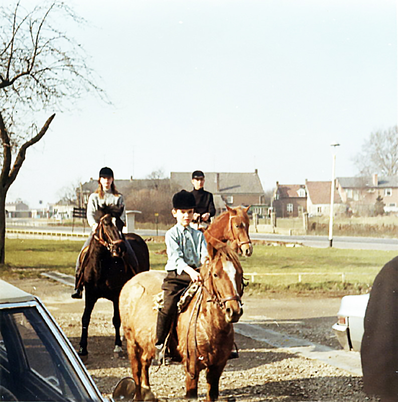 (07259) Leden van de ponyclub op de parkeerplaats van Hornerhof ter gelegenheid van de bruiloft van Piet Graef en Els Huyskens (8 maart 1969)