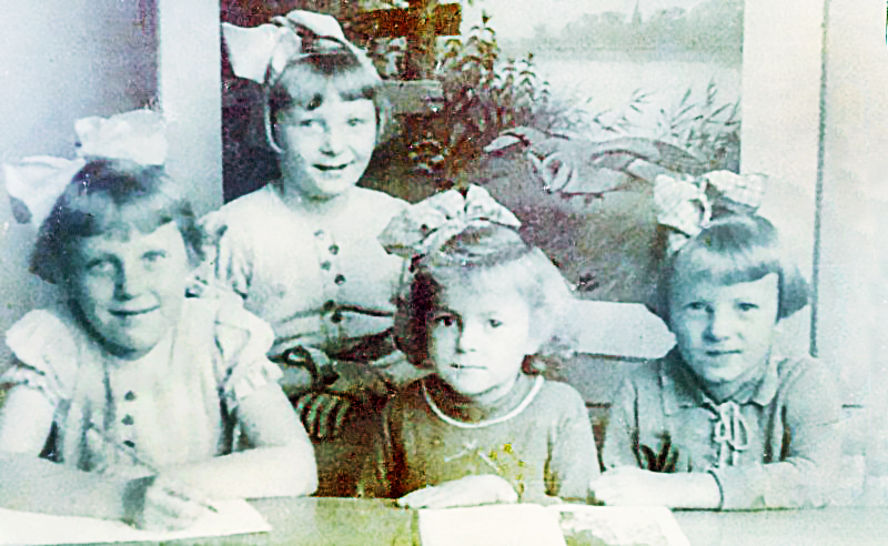 (13063) Een klassenfoto van de kinderen Linssen: v.l.n.r. Mia, Riet, Corrie en Truus