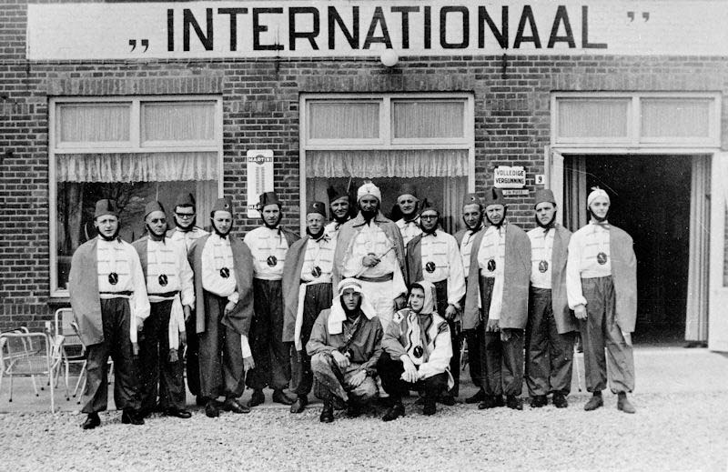 (00098) De Heibaezems waren rond de carnaval actief in de Hei (rond 1960). Op de foto: V.l.n.r.:Huub Rodeschild, Bair Stockbroecks, Har Derikx, Har Theunissen, Thei Clout, Matje Verstappen, Guus Meeuwissen, Sjaak Puts (als sultan), …Theunissen, Pietje Engelen, Sjaak Peters, Bair Hamans, Sjra Hinzen en Jos Driessens. Zittend v.l.n.r.: Tjeu Stockbroecks en Pieter Derikx