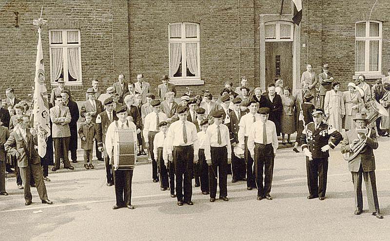 (08749) Harmonie De Drie Horens bij de inhuldiging van burgemeester L. Kirkels (1933). Met vaandel: Michel Colbers en verder Beulen Teun, Louis Schreurs en Thei Vermeulen