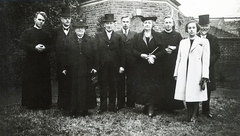 (05221) Een foto met neomist Wim Delhoofen in de Kerkstraat. Tweede van links is Drikus Peters (1870-1949), koster en secretaris-penningmeester van het kerkbestuur tevens kassier van de Boerenleenboek. Derde van links is zijn zus Petronella Peters, kösters Nel (1872-1961)