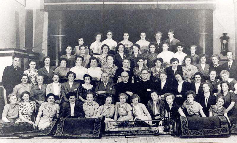 (00582) Leden van de Boerinnenbond presenteren in het Patronaat de smyrna lopers voor in de kerk (1954)