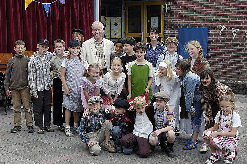 (03594) Een groep leerlingen met juffrouw Lintjens en meester Peeters bij BS De Mussenberg