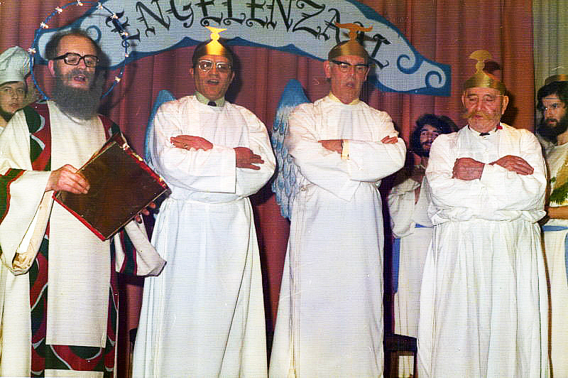 (06468) ‘De Hemelscène’ met op de voorgrond v.l.n.r. Piet Spee, burgemeester Karel van Gerven, pastoor Van Mierlo en Harie Caris. Foto is gemaakt tijdens de Bóntje aovendj in de Beatrixzaal in 1975