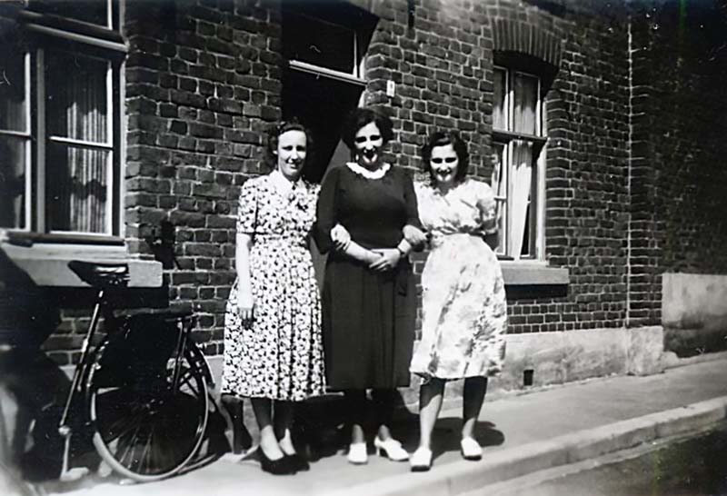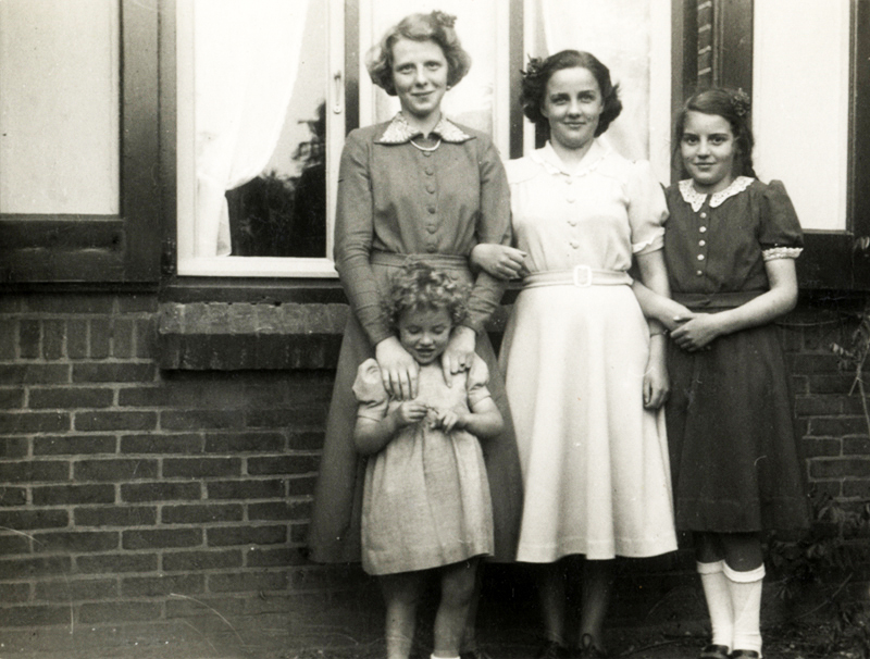 (03282) De foto is genomen vóór het huis van Familie Caris-Geraedts aan de Oude Weerterweg. Op de foto staan, van links naar rechts, Els Giebels (1935-2011) en de zusjes Leentje (1935), Els (1939) en het kleintje is Anne (1946) Caris. (Foto 1949/1950)