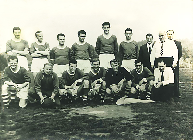 (03547) Kampioenselftal van KSV Horn met gehurkt v.l.n.r.: Fer Maessen, Jan Bruisten, NN, Ger Smeets, Jan Knoups, Tjeu Lnoops en Bair Hamans. Staand v.l.n.r.: NN, Har Meeuwissen, Frits Beulen, NN, Har Bindels, Sjra Knoops, Drees Opbroek, Harrie Caris en Hermans Schreurs.