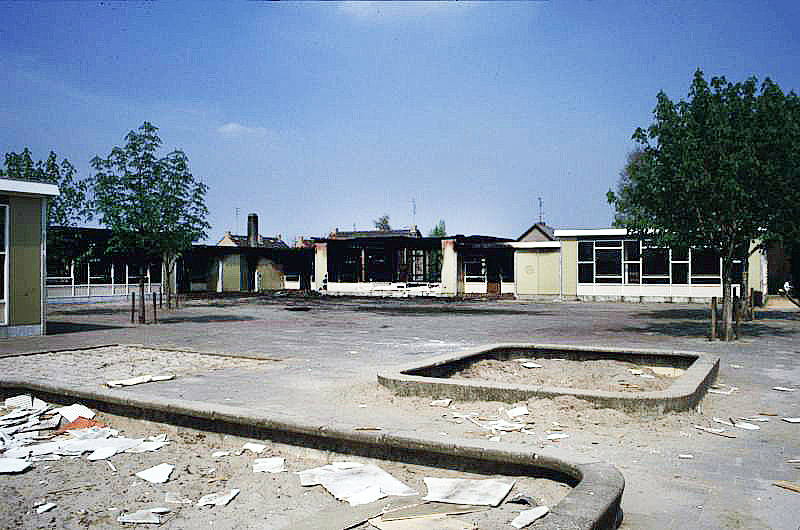 (06248) Een foto van Kleuterschool ’t Kwetternest, in het voorjaar van 1986, door brand verwoest