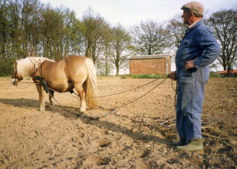 (06358) In de jaren ’80 werden werkzaamheden op het land door Wiel Knops (1925-2013) nog op ouderwetse, handmatige wijze met paarden uitgevoerd