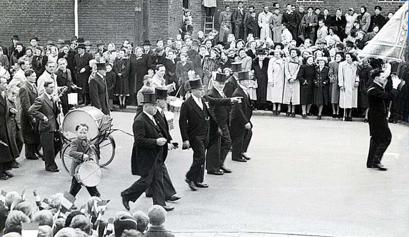 (08784) Een foto van een gedeelte van een rondtrekkende harmonie De Drie Horens op het Raadhuisplein (1954)