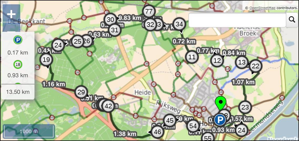 De wandelroute start op de hoek Raadhuisplein - Kerkpad te Horn. Hier kan ook geparkeerd worden. Via de knooppunten 57-18-24-23-22-13-12-11-34-33-32-77-30-31-26-25-24-19-29-41-42-46-45-54-55-57 komt u weer terug bij het startpunt. Lengte route circa 13,50 km.